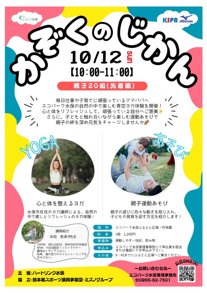 先着順で親子20組限定となりますが、ヨガで体をリフレッシュさせながら子どもとたっぷり遊んで絆を深める素敵な旧地涌をエコパーク水俣で過ごしませんか?