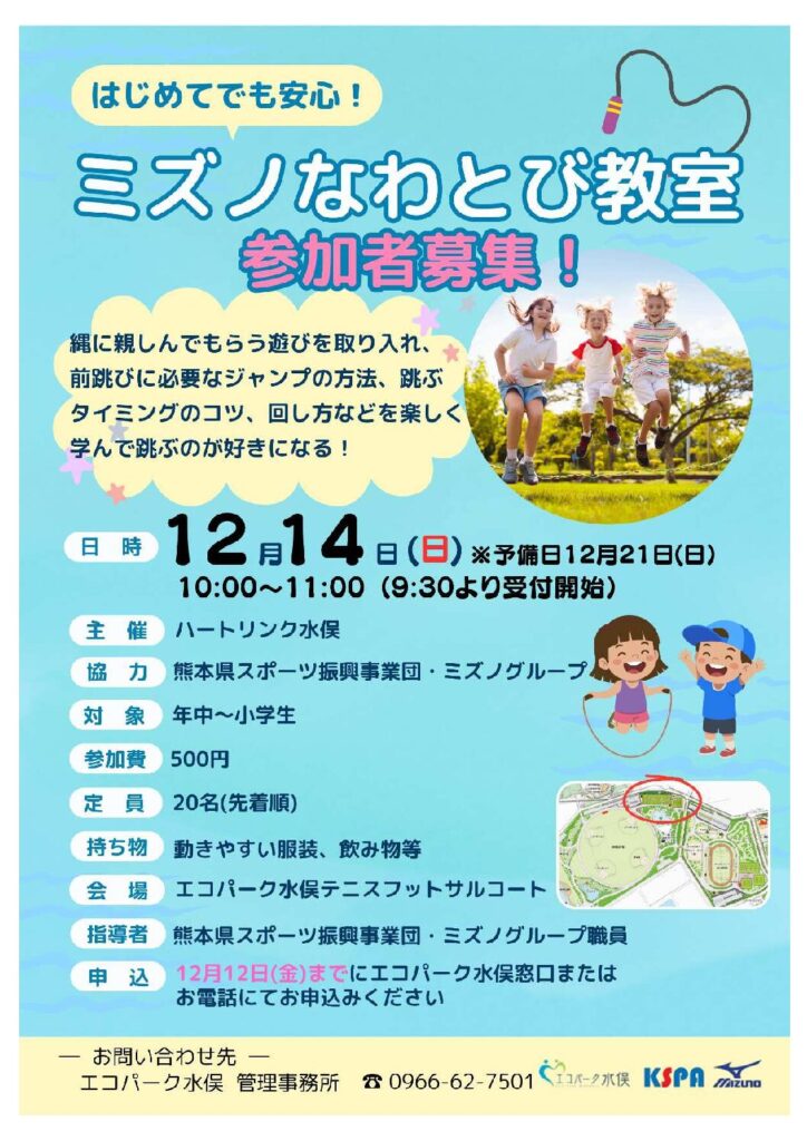 12月14日(日曜日) 「ミズノなわとび教室」開催! 2025 11/21 新着お知らせ お知らせ イベント 2025年11月21日 FacebookXHatenaPocketCopy 新着お知らせ お知らせ イベント よかったらシェアしてね! URLをコピーしました! URLをコピーしました! 【2025年11月16日(日)】feel YOGAへの参加ありがとうございました♪ 関連記事 【2025年11月16日(日)】feel YOGAへの参加ありがとうございました♪ 2025年11月17日 水俣の自然を感じながらYOGAをしませんか?「feel YOGA」開催! 2025年11月4日 2025年10月26日(日)レアスポーツフェスティバル開催 2025年10月24日 2025年10月18日(土) スポーツ体験イベント はじめてのスポチャレ 2025年10月15日 【開催日変更のお知らせ】親子遊びで子どもと絆を深める「かぞくのじかん」 2025年10月10日 2025年11月7日、14日 (金) 元気貯金教室のお知らせ 2025年9月19日 2025年10月26日(日)KIDSアルティメット教室開催のお知らせ 2025年9月11日 2025年10月12日(日)親子遊びで子どもと絆を深める「かぞくのじかん」 2025年9月11日